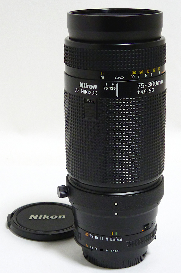直進式ズームレンズAF NIKKOR 75-300mm f4.5-5.6 No.373*** *鏡胴すれ傷,レンズ内部チリあり レンズ構成:11群13枚 フィルター径:62mm最短撮影距離:3m マクロ:1.5m 全長:約174mm(75mm時) 重さ:850g
