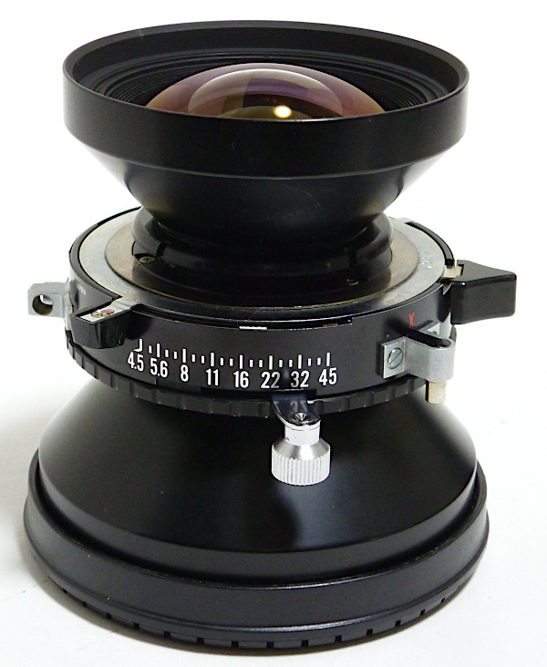 レンズ構成:4群7枚イメージサークル:200mm フランジバック:81.3mm 包括角度:106° フィルター径:67mm最大適用画面寸法:キャビネ(114x158mm) 全長:73.5mm 後枠外径:60mm 重さ:420g