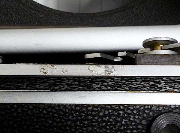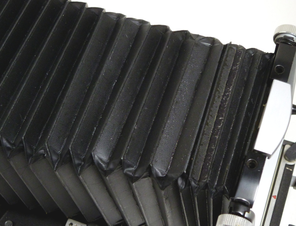 距離計付 No.6451*** *下の画像の1枚目と2枚目のように、 蛇腹は全体的に光線漏れしています *日本製テヒニカ用交換用蛇腹付 *傷・メッキ剥がれ・塗装剥がれ・革浮き・革縮みあり *前枠部の止まり(ロック)が弱く、指で押すと奥に戻ります *カム調整時、距離スケールをセットするプラスチック製のパーツが欠品 現状渡し 特価 128,000 (税込)