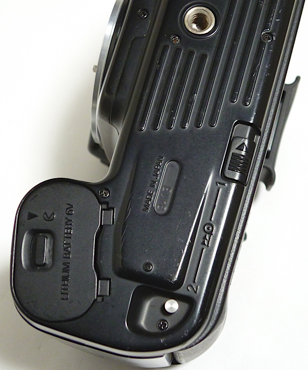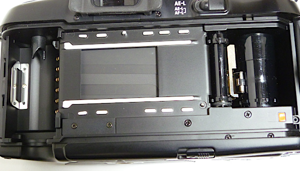 巻き戻しポタンロック解除レバーと巻き戻しポタンの操作でモーターで自動巻戻し(36枚撮りで約26秒) |